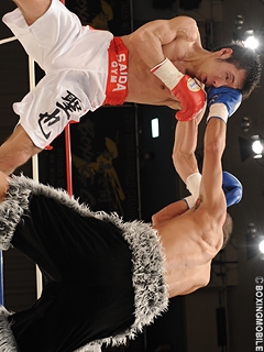 試合:開始からジャブ・ワンツーを積極的に打ち合う両者。ここで吉田がジャブ・右クロスで平川の膝を落とし、追撃の右アッパーでダウンを先制。2R、ダウンを奪われた平川はポイントの挽回を計り、ワンツー・左ボディで前に。だがラウンド終了間際、詰める平川に吉田はカウンターの右クロスで2度目のダウンを奪う。ポイントを取り返したい平川はワンツー連打で攻め込むも、吉田は打ち終わりを狙い、右アッパー・左フック。7R、ここまで試合の主導権を握り続けた吉田が、右ストレートからワンツーを平川に畳み込み、レフェリーストップを呼び込んだ。★