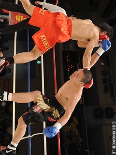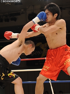 試合:4年振りのリングとなる元日本フェザー級ランカー伊藤。ゴングと同時に、弾かれたように伊藤が右ストレートで前に。サウスポー有馬もジャブ・右フックで距離を保つ。伊藤は飛び込みながらの右ストレートでペースを引き寄せるが、有馬もタイミングを掴み右フックを打ち返す。5R、上体を振り低い姿勢で入る伊藤に、有馬はカウンターの右フックをヒット。この一打で伊藤は左目上をカット。この傷が予想以上に深くドクターストップに。伊藤は4年振りの復帰戦を勝利で飾れず。対する有馬はキャリア初のTKO勝利を奪い6勝目を上げた。