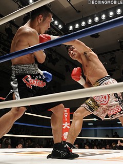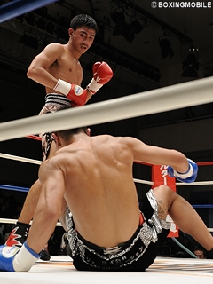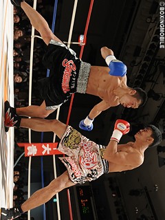 試合:タイ国王者ジョムトーンは、ユッタリと構え素早いジャブから強打の左ストレートを打ち抜く。杉崎も右ストレートを返すが、ジョムトーンにバックステップで距離を置かれてしまう。2R、距離を掴んだジョムトーンは、コンパクトで速いワンツーを放ち、杉崎からダウンを先制。さらに3R、正面に立つ杉崎に左ストレートを浴びせ、再びワンツーでダウンを奪う。立ち上がる杉崎のダメージは深く、左ストレートを上下に打ち分けられコーナーを背負ってしまう。ここをジョムトーンは見逃がさずワンツー連打を打ち込み、レフェリーストップを呼び込んだ。ムエタイも戦うジョムトーンは、昨年20歳でデビューしこれで2戦2勝(2KO)。とんでもないタイ人選手が現れた。★★