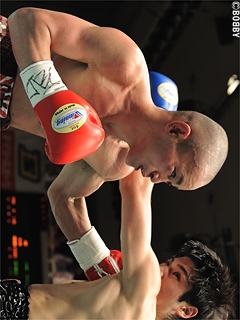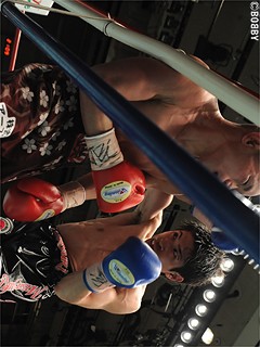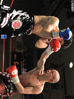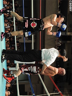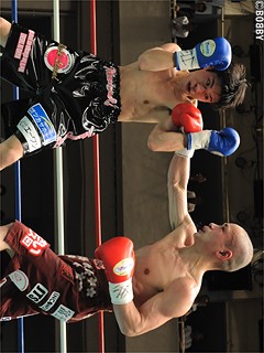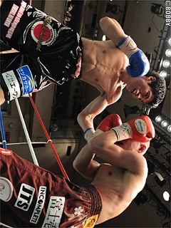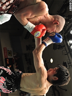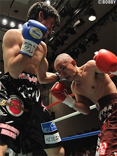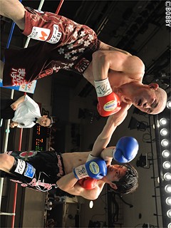 試合:黒田の強打が王座を奪う!!立ち上がり、黒田の右ストレートが早くも家住を捉え、左ボディ・右ストレートと上下に打ち分ける。しかし家住も押し切られず、黒田の右ストレートに合わせ左フックを返す。中盤、身長で上回る黒田はプレスを掛け、ワンツー・左ボディで前にでるが、家住も回転の速いワンツー連打・ワンツーフックと手数で対抗。終盤に入った8R、家住は上体を振りながら左フックで仕掛けるが、黒田のスウェーに空を切る。ここでバランスを崩した家住に黒田の右ストレートがクリーンヒット。膝が揺れる家住を見逃さず、黒田は家住をロープに詰めて強打の左ボディ・ワンツー・右ストレートと連打で畳み込み、レフェリーストップを呼び込んだ。★★