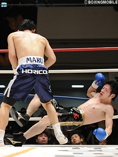 試合:サウスポー丸山に森下が定石通り右ストレート・左フックで仕掛けると、丸山はカウンターの右フックで応戦。2R、丸山は森下の右ストレートに対し、被せるように左ストレートをヒット。ここから丸山が左ストレートを上下に打ち分け、森下にロープを背負わせると、左ストレート・右フックをクリーンヒット。この連打で森下は崩れ落ち、レフェリーはカウントを数えることなく試合を止めた。丸山がKOで森下を下し、ランカーの実力を見せつけた。