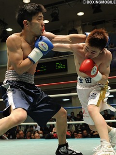 試合:立ち上がりからジャブ・ワンツーと素早いパンチの応酬。濱中が力強いワンツーを打ち込めば、金田も上体を小刻みに振って足を使い、左フックで応戦。中盤、ワンツーで圧力を掛ける濱中に、金田はサイドに動き、ワンツー・左フック・右アッパーと回転の速い連打で主導権を引き寄せる。濱中はワンツーをヒットさせるも、KOを意識してか単発の攻撃に。金田が最後までフットワークを駆使し、サイドからワンツー・左右フック・右アッパーと高速連打でポイントを奪い、最大で5ポイント差をつけランカー対決を制した。★