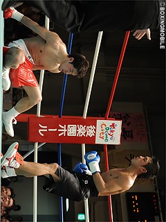 試合:今大会注目の横山は、スピード、パンチ力、回転ともに抜群。だがKOを意識しすぎてか無駄な動きが多い。2R、初回から横山に飲まれ気味の西澤も打ち合いのなか、右で横山の膝を揺するが、これで火のついた横山が連打でダウンを奪う。さらにラッシュをかけると、レフェリーストップと同時にタオルが投げ込まれた。横山はこれで5勝(5KO)1敗。1敗は昨年新人王準々決勝での敗戦。今年はリベンジに燃える。