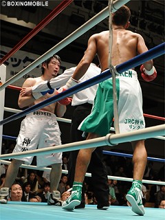 試合:外園のジャブが冴え渡る。外園は立ち上がりからジャブで赤澤の顔を跳ね上げる。赤澤も左右フックで強引に出るが、外園はバックステップでヒットを許さず。ジャブで距離を支配する外園は、中盤から左ボディ・右ストレートを攻撃に組み込み5R、ジャブ・左ボディで赤澤にコーナーを背負わせ、ワンツー連打でレフェリーストップを呼び込んだ。★