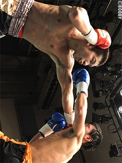 試合:杉崎がランカーの実力を見せつける!ジャブでサイドに動く名雪に、杉崎はドッシリ構えて動きを見極めバックステップ。杉崎はジャブの打ち終わりを狙い、右ストレート・左フックでヒットを重ねる。ここで名雪もワンツー・右ストレートで反撃を試みるがも、杉崎のバックステップに連打を奪えず。杉崎は左ボディで足を止め、右クロス・左フックでポイントを奪い、最大で5ポイント差をつけた。