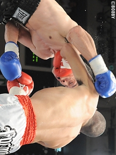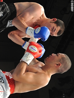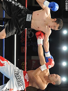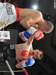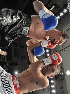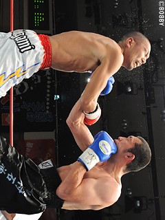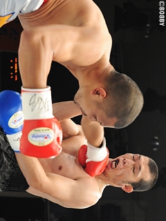試合:淵上、挑戦者のアゴを砕く!王者・淵上がジャブで牽制し、左ストレートを上下に打ち分ける。挑戦者・田島も単発ながら右ストレートをヒットさせるが、懐の深い淵上は連打を許さない。3R、距離を掴んだ淵上は、モーションの小さいワンツーで田島からダウンを奪う。何とか立ち上がる田島に、淵上は猛然と襲い掛かるも攻め切れず。中盤、淵上はKOを意識し、左ストレート・右フックが大降りとなり、バランスを崩したところに右アッパーを打ち込まれる。しかし5R終了時、試合は急展開。田島は3Rのダウンでアゴを骨折した疑いがあり、セコンドは棄権を申し出る。これが受け入れられ王者・淵上のTKO勝利となり、V2防衛に成功した。