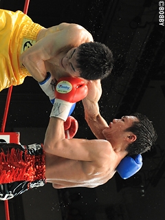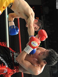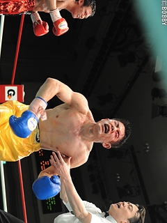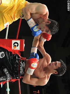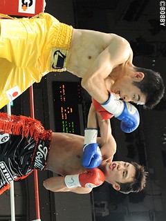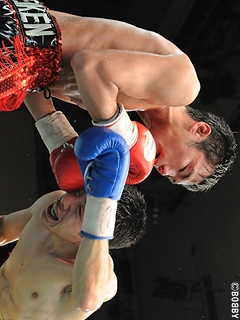 試合:五十嵐、苦戦も初防衛!序盤から挑戦者・吉田が左右フックで詰め、接近戦を仕掛ける。王者・五十嵐はバックステップで距離を取り、左ストレート・右フックを打ち込むも、強引に前にでる吉田に距離を詰められ揉み合いの展開に。中盤、今度は五十嵐が距離を詰め、左ストレート・右アッパーで組み立てるが8R、度々の遇バツで吉田は左前頭部をカット。出血が激しく、ここで試合はストップ。負傷判定となるも、五十嵐がコンパクトなパンチでポイントを奪い、僅差判定ながら王座初防衛に成功した。