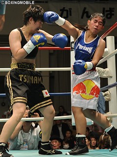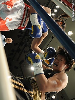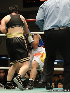 試合:ツナミ、堂々のV4防衛!開始から圧力を掛けるツナミは、左ボディ・ワンツーをヒットさせると、ペッチサイルーンの反撃をしっかりとブロック。早々に主導権を引き寄せた王者は2R、リズム良く左ボディ・ワンツーと打ち込み、防戦一方の挑戦者に左フックでダウンを奪う。粘るペッチサイルーンもワンツー連打で抵抗するが、ツナミの圧力を止められず、左ボディでロープを背負ってしまう。ここをツナミは逃さず、ワンツー連打・左ボディと畳み掛けると堪らずレフェリーが割って入った。ツナミが危なげない内容でV4防衛に成功した。★★