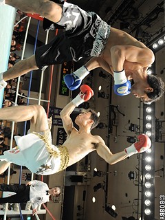 試合:中胡のコンパクトなワンツーに、勢い良く振り抜いた遠藤の右ストレートがヒット。大きく腰が沈む中胡に、遠藤は左フック・右ストレートでダウンを奪うと、10カウントが数えられた。