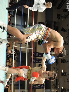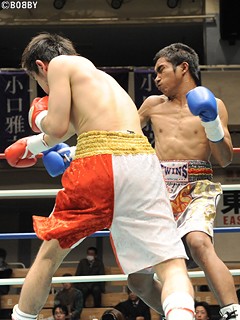 試合:低い姿勢からアティワットがワンツーで攻め込むが、安慶名はブロック・スウェーでヒットを許さない。逆に左ボディ・右ストレートでアティワットを亀状態にし、一気の連打でレフェリーストップ。