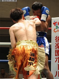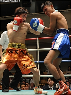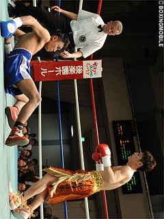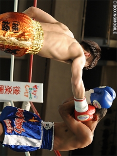 試合:余裕の3ノックダウン!ゴングと同時にワンツーを打ち込むソムサクだが、上体が流れ大振りに。早くも相手の力量を見極めた林は、右アッパー・左フック・右ストレートのコンビネーションでダウンを奪う。立ち上がるソムサクは、ワンツー連打で再びダイブ。足元が定まらずもレフェリーは試合を続行。案の定、林の左フック・右ストレートに敢え無く崩れ落ちた。