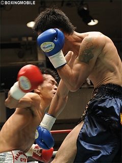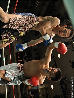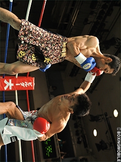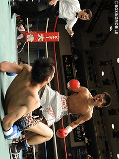 試合:伊藤の右フックがジャストミート!開始早々、伊藤が思い切り良く右ロングフックを振り抜く。この一撃が寶のアゴを捕らえ、早くもダウンを奪う。2R、寶は距離を取りジャブ・右アッパーで応戦するも左のガードが低く、再び伊藤の右ロングフックを被弾しダウンを追加。立ち上がるもダメージは深く、伊藤のワンツー連打にレフェリーストップ。