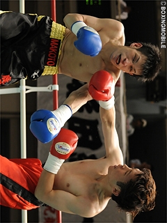 試合:中島、ワンツーで勝利!ワンツー・左フックで詰める松山に対し、中島はジャブで距離を測りワンツーを打ち込む。2R、中島はジャブで距離を保ち、ワンツー連打で松山の膝を落とす。松山もワンツーで反撃を試みるが、中島は足を使い、サイドに動き的を絞らせず、コンパクトな右ストレート・左ボディで追い込む。最終5R、ダメージの濃い松山に、中島は右ストレートからワンツー連打を浴びせ、レフェリーストップを呼び込んだ。★