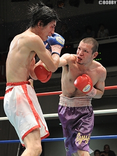 試合:三垣が打撃戦を制す!ゴングと同時、挑戦者・川瀬がワンツー・右クロスで攻め込むと、王者・三垣は冷静にジャブで川瀬の出足を止め、距離を測ってワンツー。2R、三垣の右ストレートに川瀬は右目上をカット。だが川瀬は怯むことなくワンツー・左フックを打ち込み、三垣もワンツー・右アッパーで応戦。ここから両者意地の打ち合いとなり、4R終了時のジャッジは三者三様ドロー(38-38,38-39,39-38)。このアナウンスにポイントを奪うべく仕掛ける両者。互いのワンツー・左フック・右アッパーがヒットする度に、後楽園ホールは"ミガキ"と"カワセ"コールが交差する応援合戦。8R、三垣と川瀬は共にワンツーを浴び、膝が落ちかける一進一退の攻防を展開。8R終了時、ジャッジに変化が現れ、判定2-1(77-76,77-75,76-77)で三垣が僅かにリード。そして運命の10R、ここまで一歩も引かないシーソーゲームを繰り広げるも、三垣はジャブで距離を取り、的確に右ストレートで川瀬の顔面を跳ね上げる。ここで膝が落ちかける川瀬に、三垣は止めのワンツーを打ち抜くと、力が抜けるように崩れ落ちる川瀬。川瀬はなんとか立ち上がるも足元が定まらず、遂に10カウントが数えられた。スタートからの激しい打撃戦を王者・三垣が制し、3度目の防衛に成功した。★★