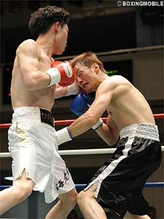 試合:海老澤が打撃戦を制す!立ち上がり、海老澤がジャブで距離を測り、右ストレート・左ボディを打ち込む。金子はワンツーで詰めるが、海老澤はバックステップで距離を保ち、左ボディはガッチリとブロックし、ヒットを許さない。中盤、金子は強引にワンツーで距離を詰め、左フック・右アッパーで海老澤のアゴを跳ね上げる。しかし海老澤は下がらず、コンパクトなワンツー・左右アッパーを連打で浴びせ、さらに左ボディを打ち込み、金子からポイントを奪った。