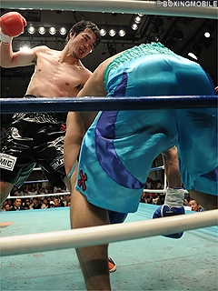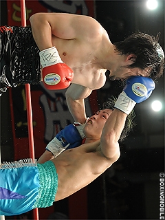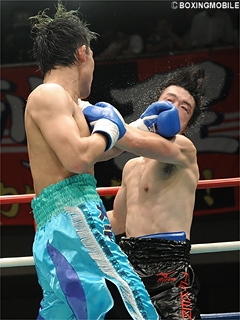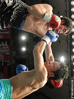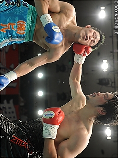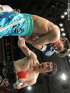 試合:佐藤の豪腕が爆発!挑戦者・氏家がジャブで距離を詰め、右ストレートで王者・佐藤の懐に飛び込む。佐藤も左フック・右ストレートで迎え撃つが、氏家はダッキングとブロックで連打を許さず。中盤、強引に入る氏家に対し、佐藤はジャブ・左右ボディで出足を止めたいが、低く入る氏家の左フック・右ストレートにバランスを崩す。しかし6R、佐藤が左右ボディで前に出ると、右ストレートで氏家をロープに押し込み、ワンツー・左右フックと怒涛の連打。ここまで耐えてきた氏家も堪らずキャンバスに両手をついてしまう。直ぐに立ち上がる氏家に対し、佐藤は右ストレートでまたもロープを背負わせる。最後はワンツー・左フックで顔面を大きく跳ね上げ、レフェリーストップを呼び込んだ。★
