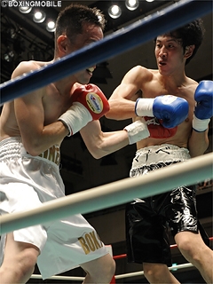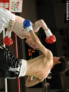 試合:ワンツーの大場に対し、斉藤はガードを固め右を狙う。すると2R開始直後、斉藤の右ストレートが決まり、ぐらつく大場。斉藤はここを見逃さず、右ストレートでダウンを先制。しかし、大場がワンツー連打で猛ラッシュをかけると、ロープを背負った斉藤は堪らずダウン。立ち上がる斉藤だがダメージの色濃く、赤コーナーからタオルが投入された。大場は準決勝で強打者・千波と対戦。