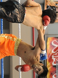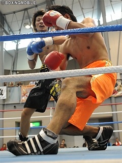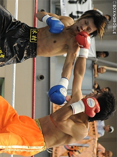 試合:足を使いジャブの木村は、ガードを固めボディを狙うサウスポー竹内を左に回ってかわし、4Rに狙いすました右ストレートでダウンを奪う。木村はこのポイントを守り判定勝利。