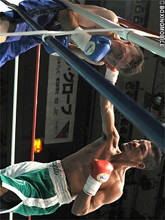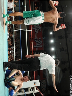 試合:外園が気持ちの強さで勝利!外園がジャブ・右ストレートで攻め込むと、サウスポー菊池は右フックでサイドに動き、左ストレートで主導権を引き寄せる。序盤に距離を掴み、左ストレート・右フックを浴びせポイントを奪う菊地だったが、4Rに外園のロングレンジの右ストレートに大きく腰を落とす。5R、外園がワンツーで前に出ると菊池も応え打撃戦となるが、外園の右ストレートがアゴを捉え、菊池はしゃがみ込むようにダウン。何とか立ち上がる菊池に対し、外園は一気のラッシュ。左フック・右ストレートからワンツー連打を畳み掛けると、菊池は堪らず崩れ落ちた。★