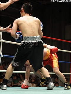 試合:ワンツーでダウンを喫した三浦は口の出血が多く、1R終了後に棄権となった。