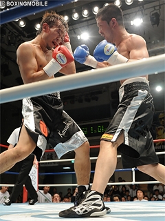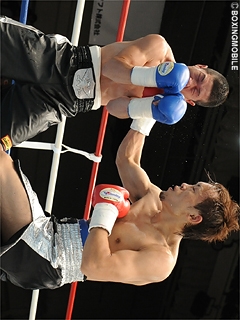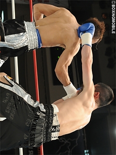 試合:椎野が右アッパーを突き刺す!仁木は右ストレート・左フックで仕掛けるが大降りとなり、ここは椎野が冷静にディフェンス。椎野はジャブ・左ボディで出足を止め、仁木に右アッパー・右ストレートを打ち込む。3R、距離を掴んだ椎野は、ワンツー・左フックで仁木を棒立ちとし、狙い済ました右アッパーでダウンを奪う。仁木も左右フック・左ボディで反撃を試みるも、椎野はバックステップで距離を保ち、ワンツー連打・右アッパーでダメージを重ねる。6R、椎野はワンツーで仁木をロープに押し込み、右アッパーでアゴを跳ね上げ、レフェリーストップとした。★