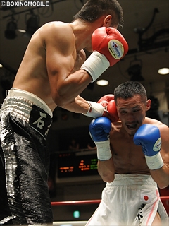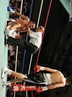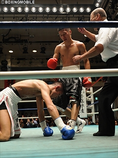試合:初回、ジャブの打ち合いも青木が手数で上回る。右の繋がりが良く、足を使っては前之園の空振りを誘う。前之園も左ボディを当てるが、青木の攻守のリズムは良く、ぺースをつかまれてしまう。しかし4R、ここまで左が冴えていた青木は、前之園が相打ち覚悟で前に出ると、ワンツー・フックに圧されてロープを背負い、右フックで痛恨のダウン。立ち上がるが、さらにワンツー・フック・アッパーと畳み掛けられ、2度目のダウンと同時にレフェリーストップ。中盤まで我慢した、ランカー前之園の強打爆発となった。