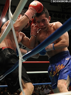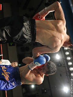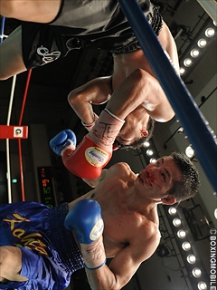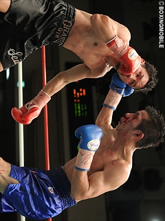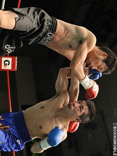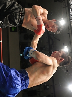 試合:岡田のパワーがポイントを奪う!挑戦者・凉野が低い姿勢から距離を詰め、左ボディ・左右アッパーで王者・岡田をロープに押し込む。岡田はロープを背負いながらも、右アッパーで凉野の左目上を切り裂き、左ボディを突き刺す。岡田の強打に怯むことなく、凉野は左ボディで懐に飛び込み、右アッパー・左ボディ・左フックと手数で対抗する。体格・パワーで上回る岡田はロープを背負うも、左右アッパーで凉野のアゴを跳ね上げ、左ボディを打ち込む。最後まで凉野も手数を繰り出すが、岡田は強打の右アッパー・左ボディで最大で5ポイント差をつけ、V2防衛に成功した。★
