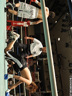 試合:3R、赤・高橋の右クロスで青・高橋がダウン。青・高橋は立ち上がり、ワンツー・フックで反撃するが、またも右を合わされ2度目のダウン。