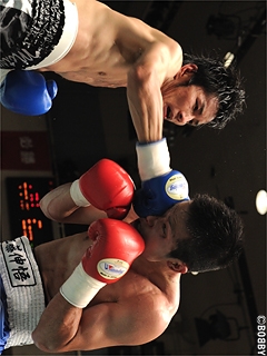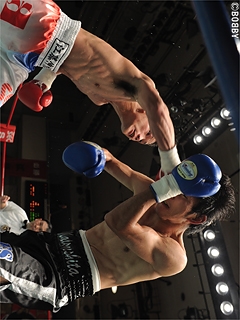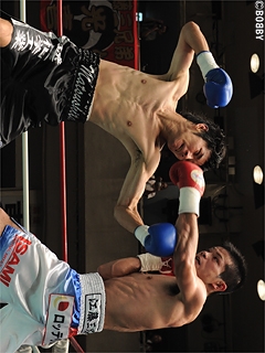 試合:江藤が1年半振りのリング!序盤、ジャブで距離を測る江藤に対し、松下は右ストレートを上下に打ち分け前に出る。すると2R、松下はワンツーから接近戦に持ち込むが、江藤のコンパクトな左フックがアゴを捉え、松下はキャンバスに膝をついてしまう。ここで江藤の勢いが止まらず、松下にパンチを打ち込んでしまい、ダウン後の加撃で減点1。しかし最後まで江藤は冷静にジャブで距離を保ち、松下のワンツーにはバックステップで空を切らせ、的確な右ストレート・左フックでポイントを奪った。