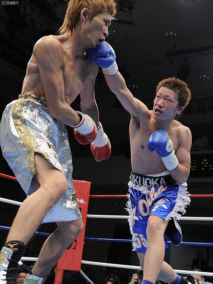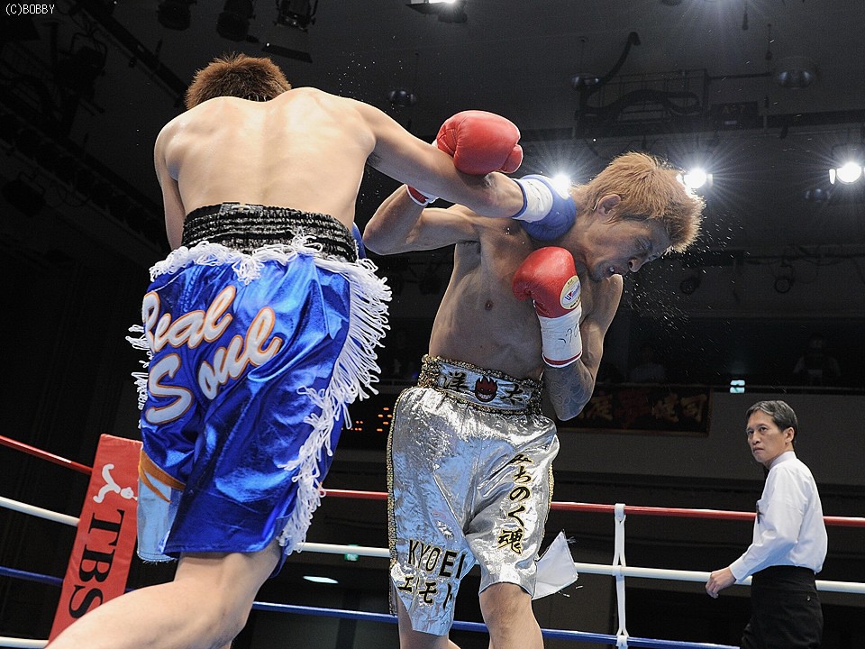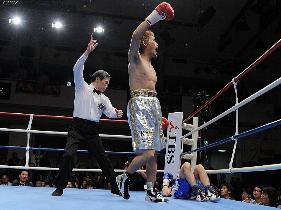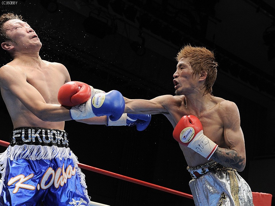 試合:佐藤、世界に向け前進!ロングレンジのジャブで王者・佐藤が距離を測り、突き刺すような右ストレートを打ち込むと、早くも挑戦者・大庭は腰を落とす。大庭も意地の右ストレートを返すが、佐藤はジャブで距離を保ち連打を許さない。序盤に距離とリズムを掴んだ王者はジャブで挑戦者のアゴを跳ね上げ、的確に右ストレートを浴びせる。すると4R、佐藤は右ストレート・右アッパーのコンビネーションで大庭の膝を揺らし、一気のワンツー連打でキャンバスに沈めると、堪らず青コーナーからタオルが投げ込まれた。王者・佐藤が無敗の挑戦者・大庭を寄せ付けず、完勝のV5防衛となった。★★