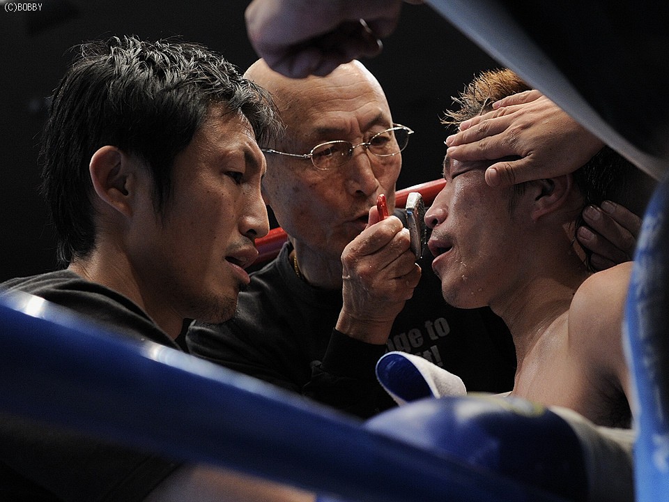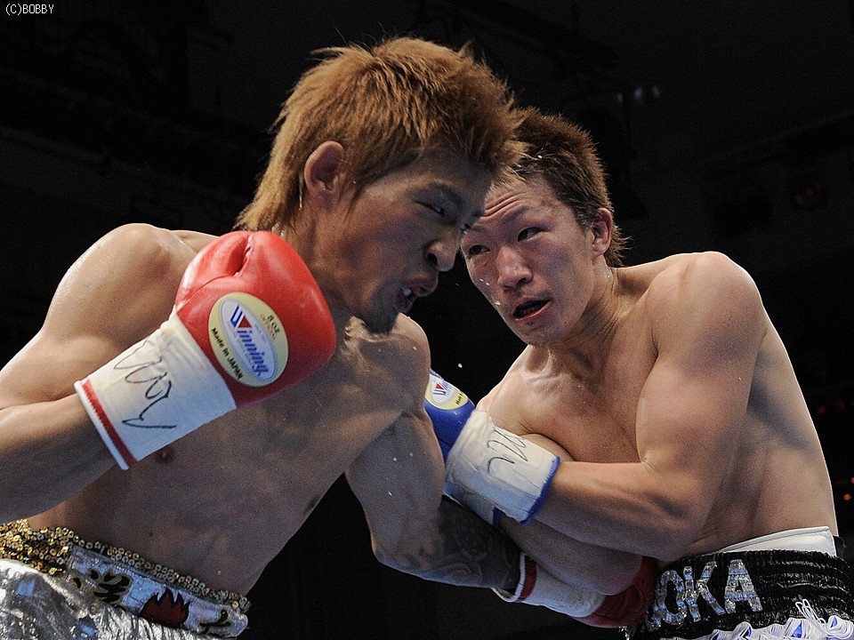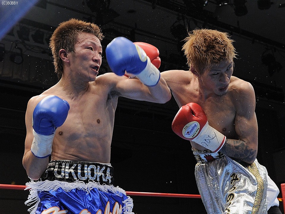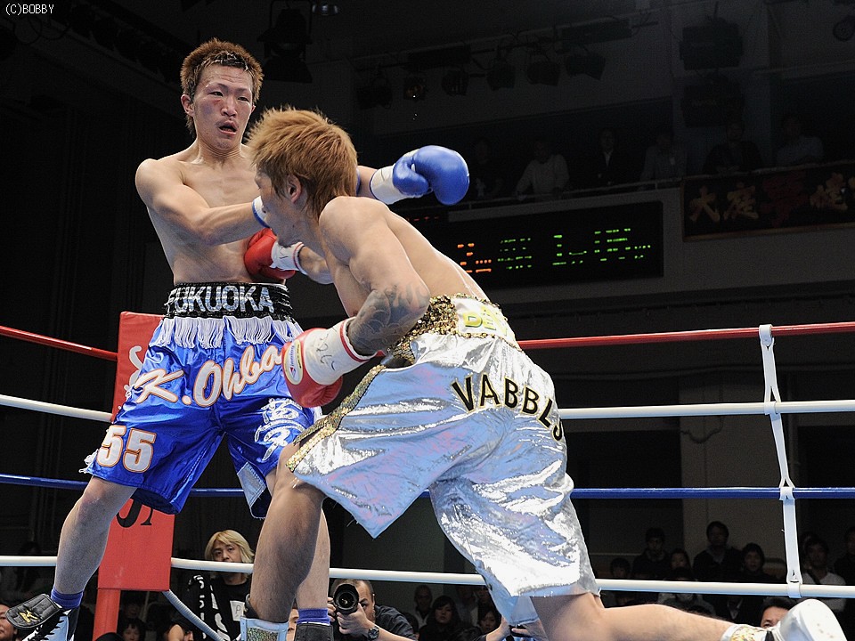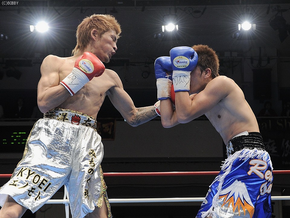 試合:佐藤、世界に向け前進!ロングレンジのジャブで王者・佐藤が距離を測り、突き刺すような右ストレートを打ち込むと、早くも挑戦者・大庭は腰を落とす。大庭も意地の右ストレートを返すが、佐藤はジャブで距離を保ち連打を許さない。序盤に距離とリズムを掴んだ王者はジャブで挑戦者のアゴを跳ね上げ、的確に右ストレートを浴びせる。すると4R、佐藤は右ストレート・右アッパーのコンビネーションで大庭の膝を揺らし、一気のワンツー連打でキャンバスに沈めると、堪らず青コーナーからタオルが投げ込まれた。王者・佐藤が無敗の挑戦者・大庭を寄せ付けず、完勝のV5防衛となった。★★