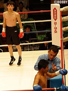 試合:立ち上がりから渡辺がジャブで先制。足を使いアウトボクシングで距離を保つ。シットサイトーンは頭を振りインファイトに持ち込みたいが渡辺を捕まえられない。渡辺がジャブから右ストレート、左フックをヒットさせダウンを奪う。ここは立ち上がりゴングに救われるシットサイトーン。2R、渡辺が仕留めにかかる。右ストレートから左フックで再びダウンを奪うと、立ち上がるシットサイトーンにカウンターでこのラウンド2度目のダウンを奪う。その後、渡辺がラッシュをかけると膝から崩れるシットサイトーン。3ダウンとなり渡辺のKO勝ち。