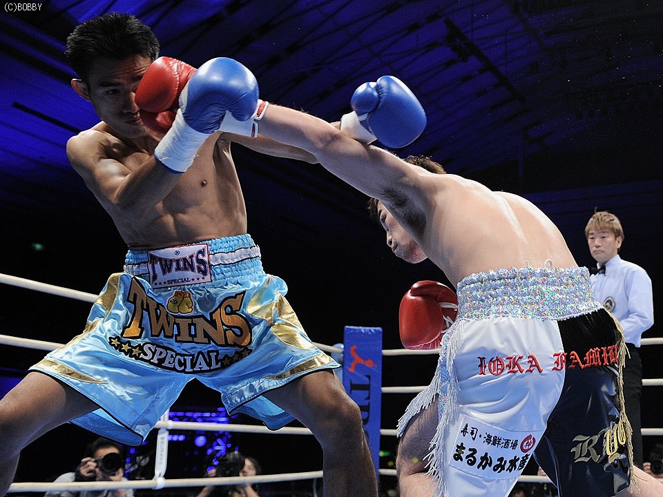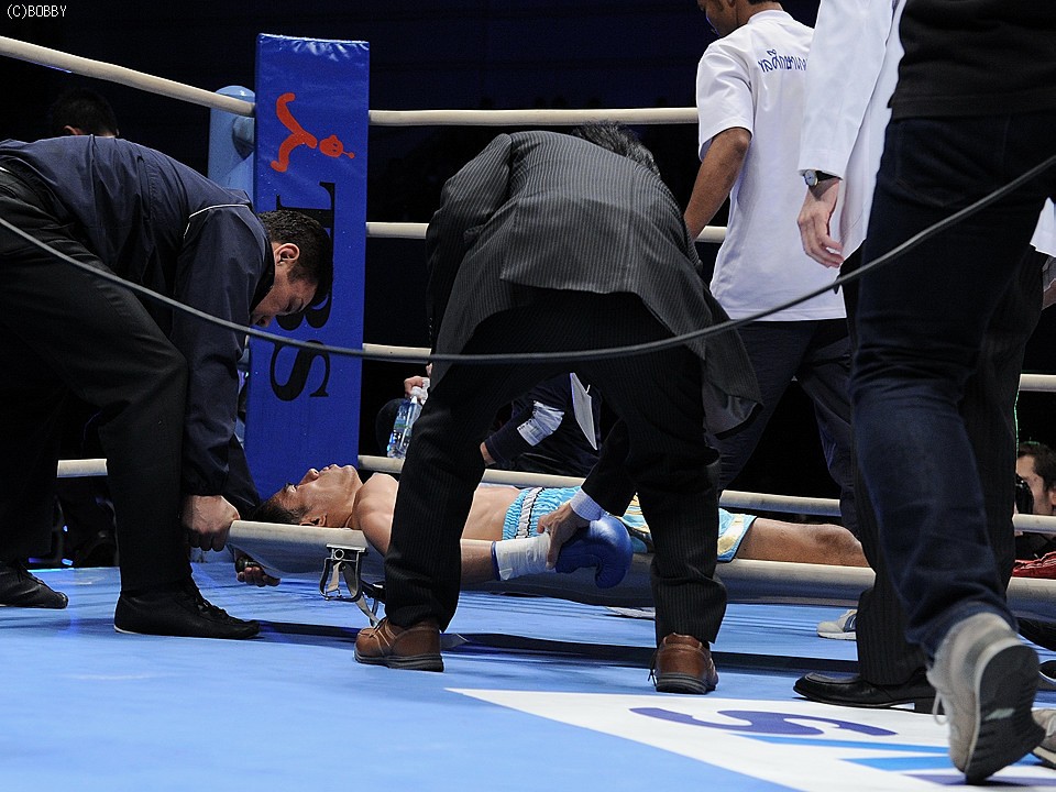 試合:試合が動いたのは3R、宮崎の左フックにスタンディングダウンを取られたキャンベット、カウントを始めると突然足がふらつきそのままリングに倒れ、タンカーで運ばれた。
