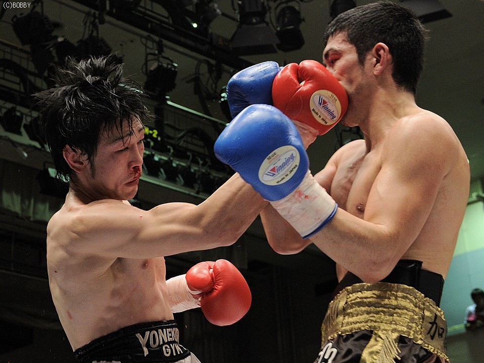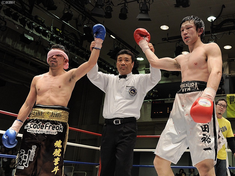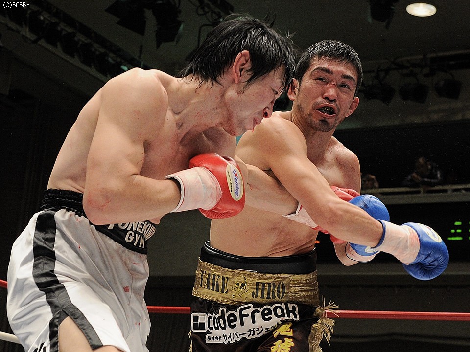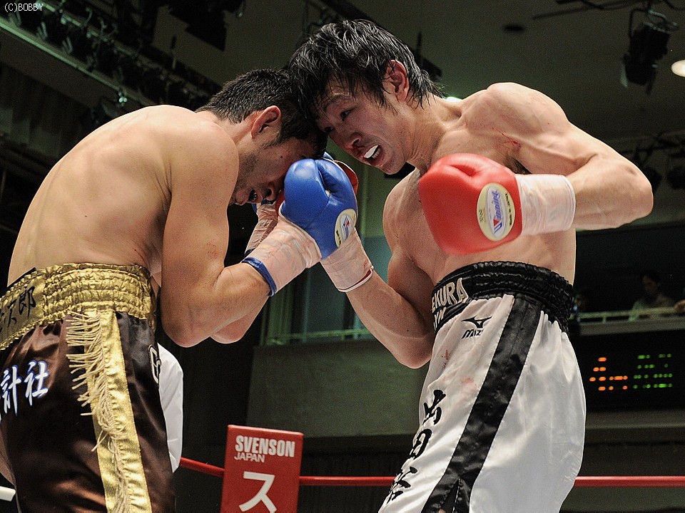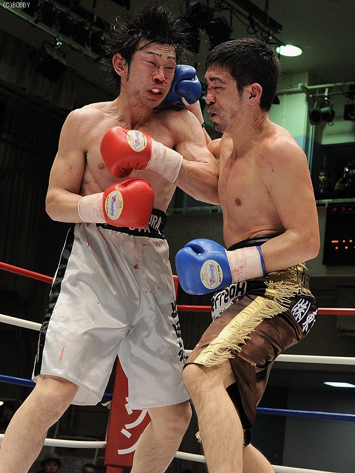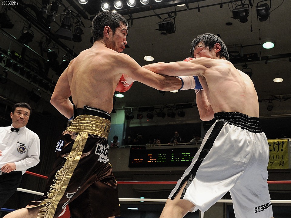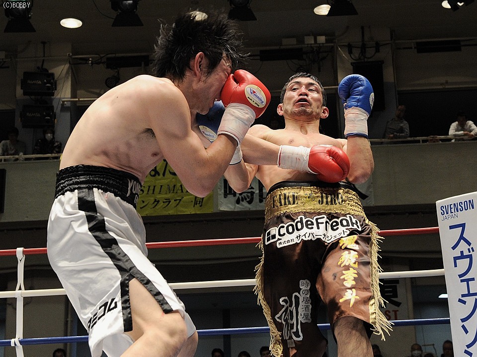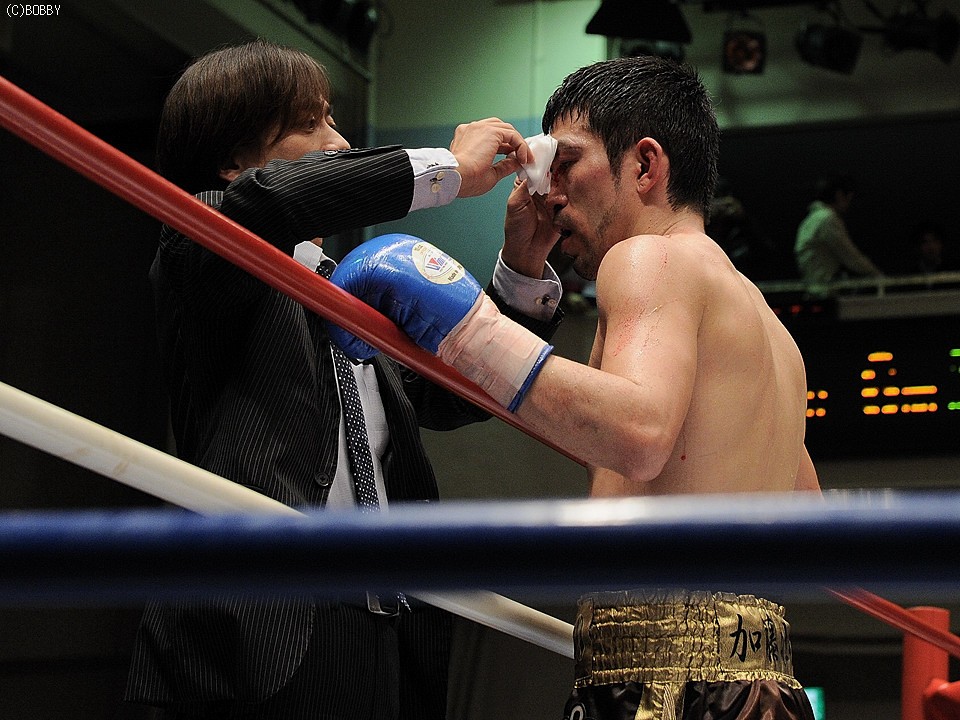 試合:両者不完全燃焼!!加藤はジャブで距離を詰め右ストレートで仕掛ける。出田も左フック・右ストレートで応戦するが、加藤のバックステップに距離を取られてしまう。加藤は距離を保ち前後の出入りから、右アッパー・左フックで出田のアゴを跳ね上げペースを引き寄せる。ここで出田も下がらず、ワンツー・左フックを加藤に打ち込み反撃を開始。だが6R、互いが踏み込んだ場面で頭が当たり、偶バツで加藤は左眉をカット。この傷が続行不可能と診断、試合は負傷判定に。しかしジャッジは三者三様ドロー、両者無念の結果となった。