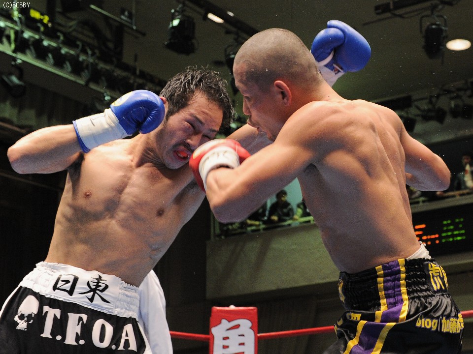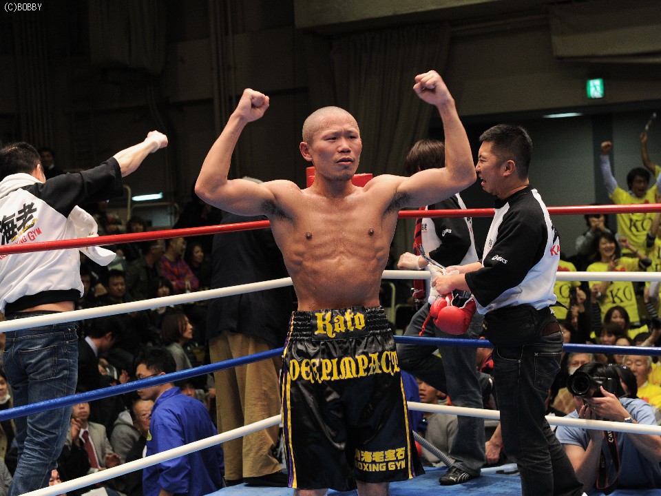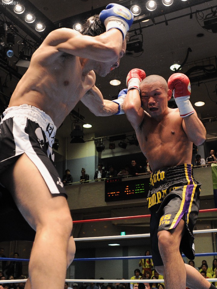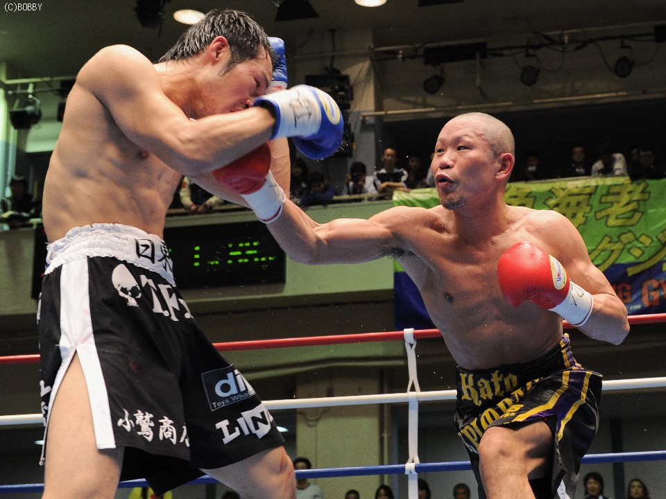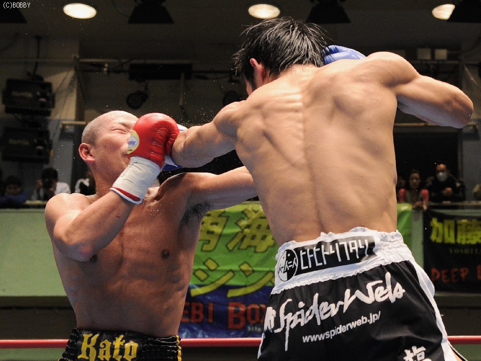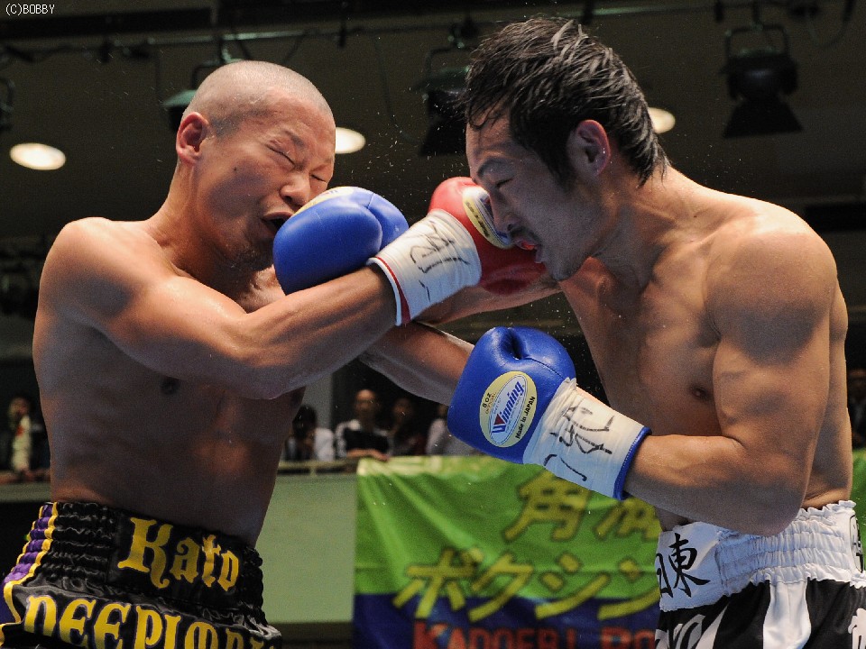 試合:加藤が薄氷の初防衛!!序盤、王者・加藤はリング中央でドッシリと構え、挑戦者・近藤を迎え撃つ。ここで近藤は足を使い左右に動き、ジャブ・右クロスで仕掛けるが、加藤は固いブロックでディフェンス。両者2度目の対戦であり、手の内を知り尽くしているのか、互いに慎重な立ち上がり。中盤、王者はジワジワと圧力を掛けるが、挑戦者は足を止めずジャブでリズムを作り、左ボディ・右クロスでポイントを奪う。加藤は圧力を掛けるも距離を詰められず、苦しい試合展開が続く。終盤、近藤は距離を保とうと動くが、加藤は圧力を増しワンツーで距離を詰め、右ストレート・左フックを打ち込む。加藤が手数・有効打でポイントを挽回し、僅差判定で近藤を退け、日本ライト級王座V1防衛に成功した。