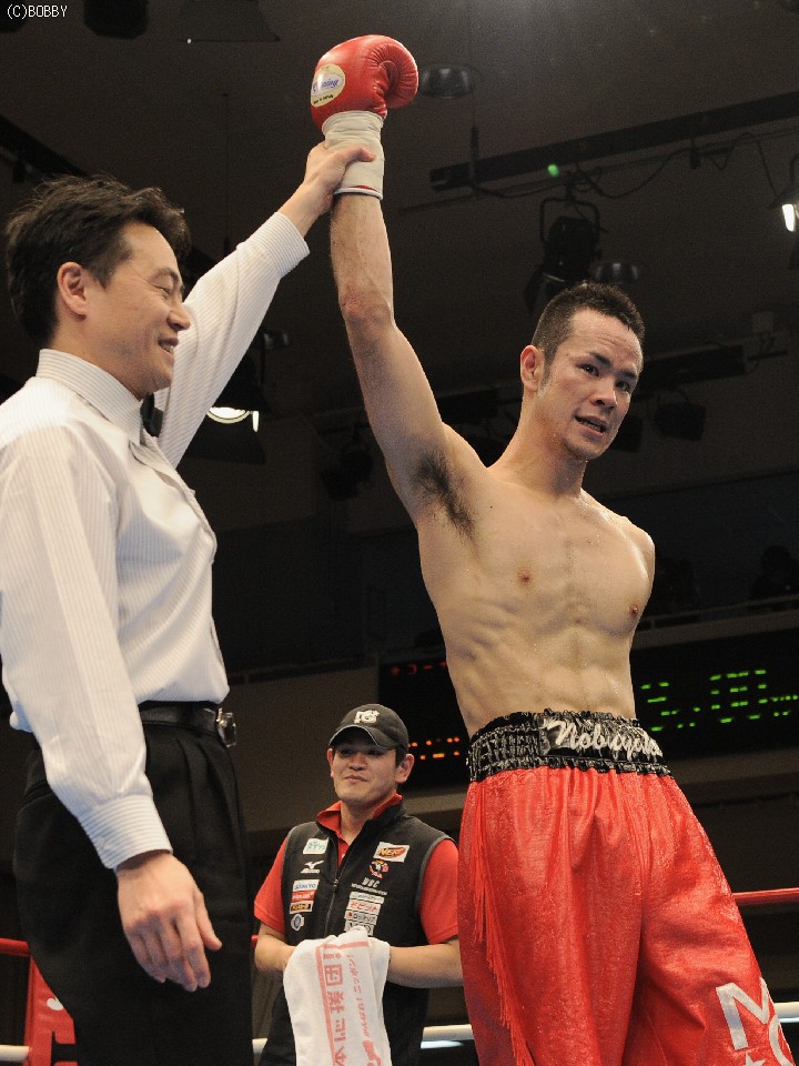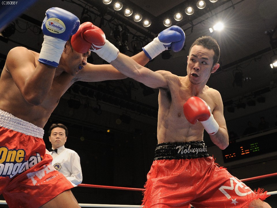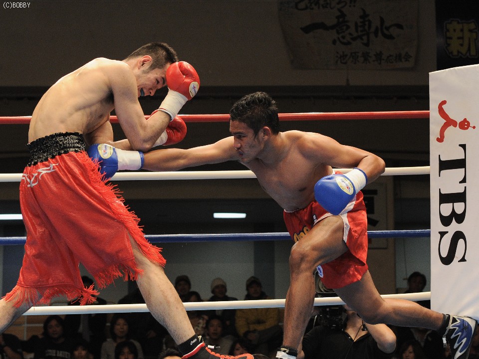 試合:新藤のボディ攻撃が冴える!!身長・リーチで上回るサウスポー新藤がジャブで距離を測り、左ボディアッパー・右フックを浴びせる。ポンスリも右ストレートで応戦するが、新藤はバックステップでヒットを許さない。新藤は的確に左ボディアッパー・右ボディを打ち込む続け、ポンスリにロープ・コーナーを背負わせる。すると5R、新藤は右ボディでポンスリをロープに押し込み、ワンツー連打を浴びせた。