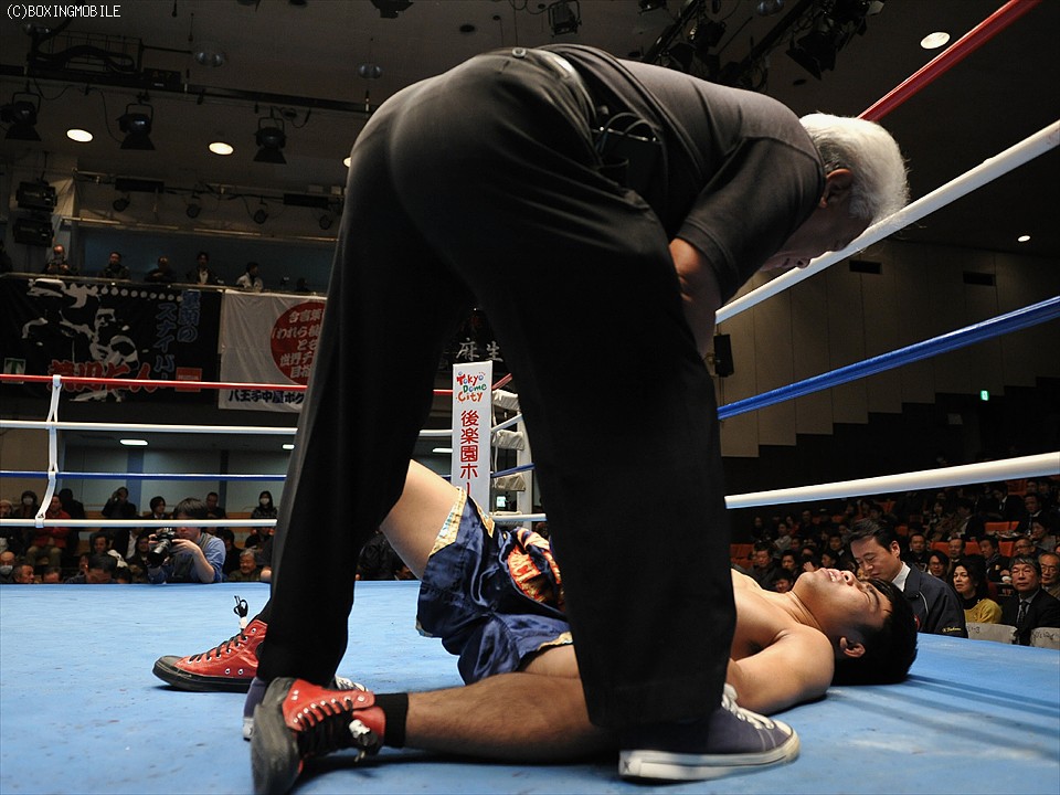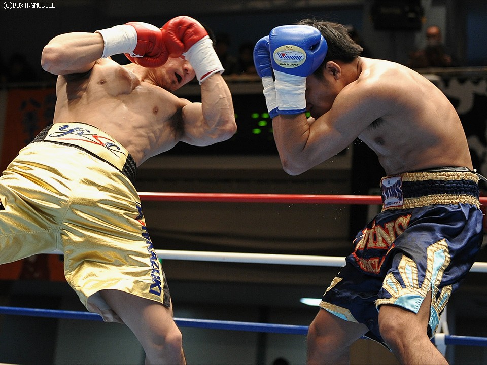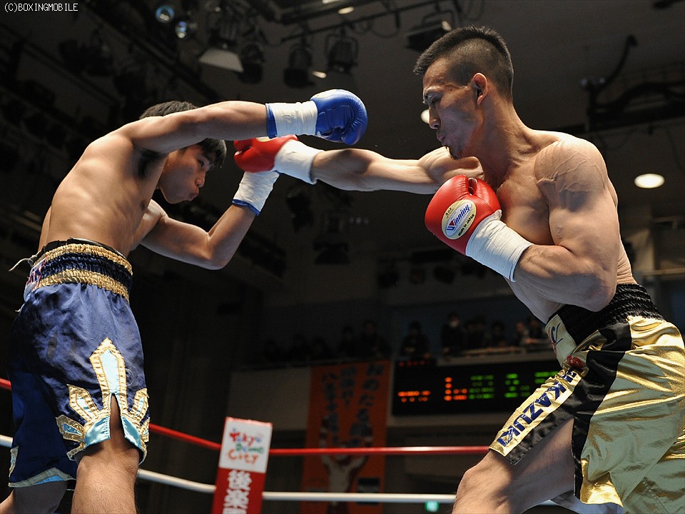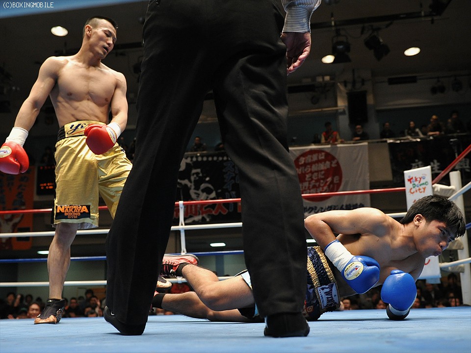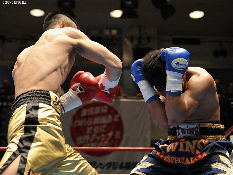 試合:林の左ボディに悶絶!!サウスポーのカオポンドに対し、林は左フック・右ストレートで様子をうかがう。カオポンドは強打を警戒しガードを固めるが、林の重さ充分の左ボディが突き刺さると堪らずタイ人はキャンバスにダイブ、10カウントとなった。