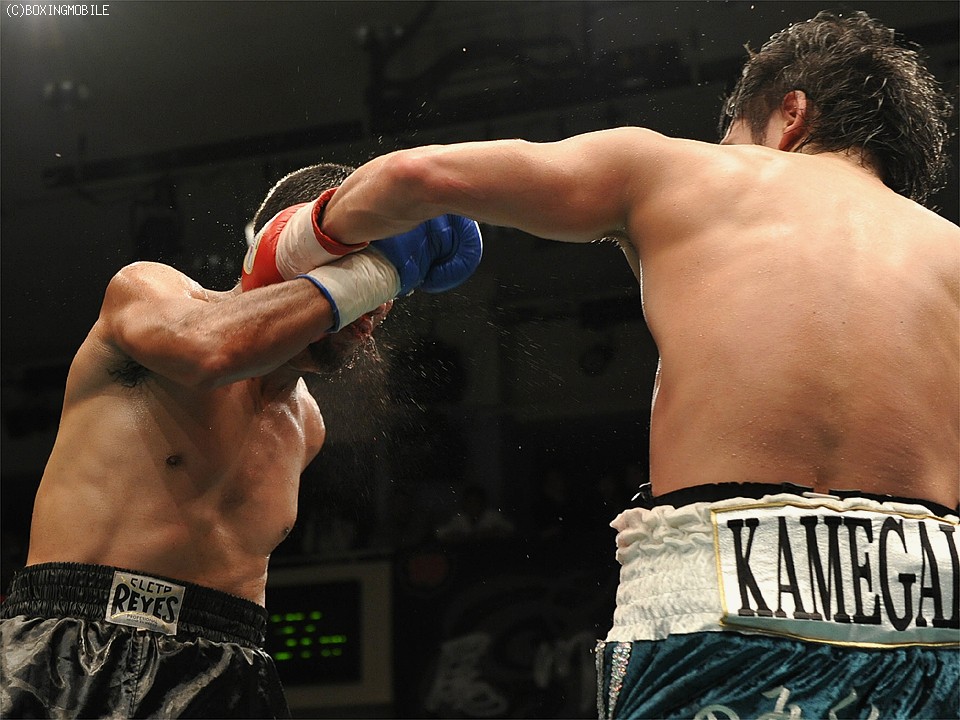 試合:亀海の連打が打ち込まれる。開始と同時にチャベスが強打の左右ボディ・右ストレートで距離を詰める。対する亀海はスウェー・ブロックでクリーンヒットを許さず、的確な右クロス・左ボディを打ち込む。中盤、チャベスは諦めることなく左右フック・左ボディで仕掛けるも、亀海は巧みなブロックからジャブで仰け反らせ、右ストレート・左ボディ・左フックでダメージを蓄積させる。すると終盤9R、亀海のパンチを浴び続けたチャベスのダメージは深く、右ストレートに腰が沈む。ここで亀海はワンツー・左フック・右ストレートと連打をメキシカンに浴びせ、レフェリーストップを呼び込んだ。