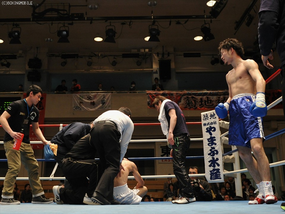 試合:足を使いジャブを上下に入れる藪に対し、坂上は体を振ってじわじわとプレス。右を狙う坂上は1発入れる間に藪に3発を返されるが、2Rに右の強打でダウンを奪う。3R、思い切って前に出る藪は坂上をコーナーに詰めるが、やはり右を合わされ2度目のダウン。レフェリーストップとなった。