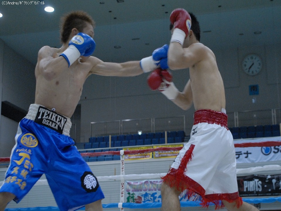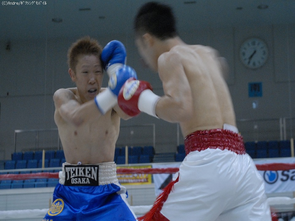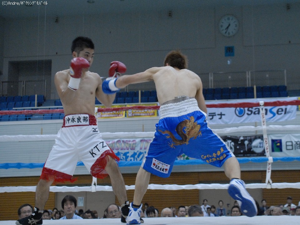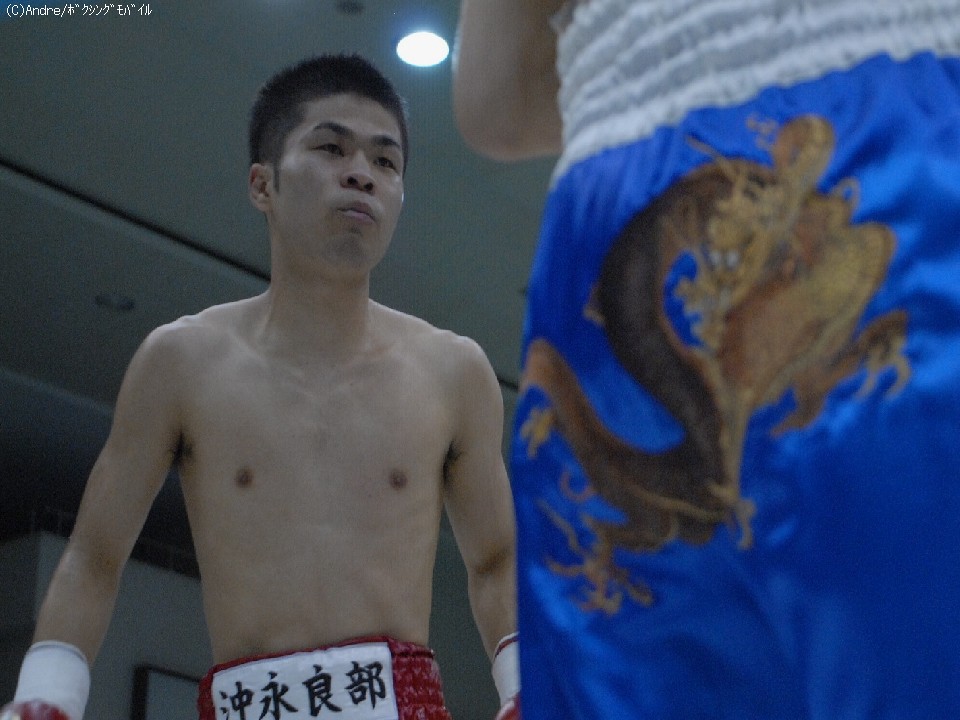 試合:序盤、壮絶な打ち合いから始まる。自身の距離感が似ている両者はどちらも一歩も引かず前に出る。が、3R、偶然のバッティングで右目の上をカットした沖田を危険と判断、ドクターストップ。試合前半の試合中止のため両者ドロー。