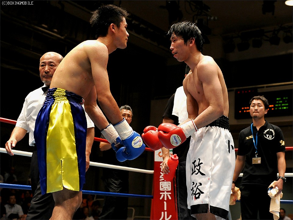 試合:ジャブが冴える藪だが右の打ち終わりに体が流れ、1Rに小林の右ストレートでダウン。小林は体を振って歩くようにワンツーでプレス。ワンツーにはキレと威力がありガードも固い。2Rに入ると、藪もワンツーとジャブの返しを出し、右の打ち終わりを修正。出入りのステップが良くなると、後半は打ち合いにも負けず、ポイントを挽回した。